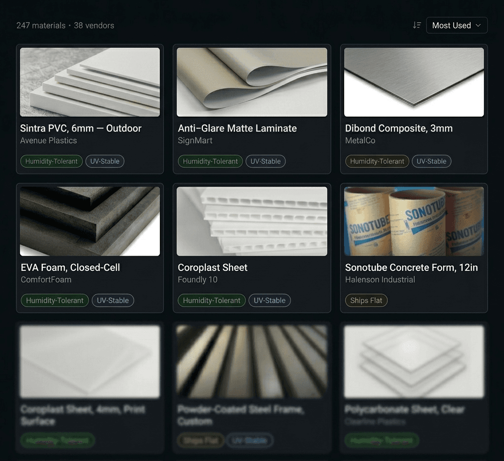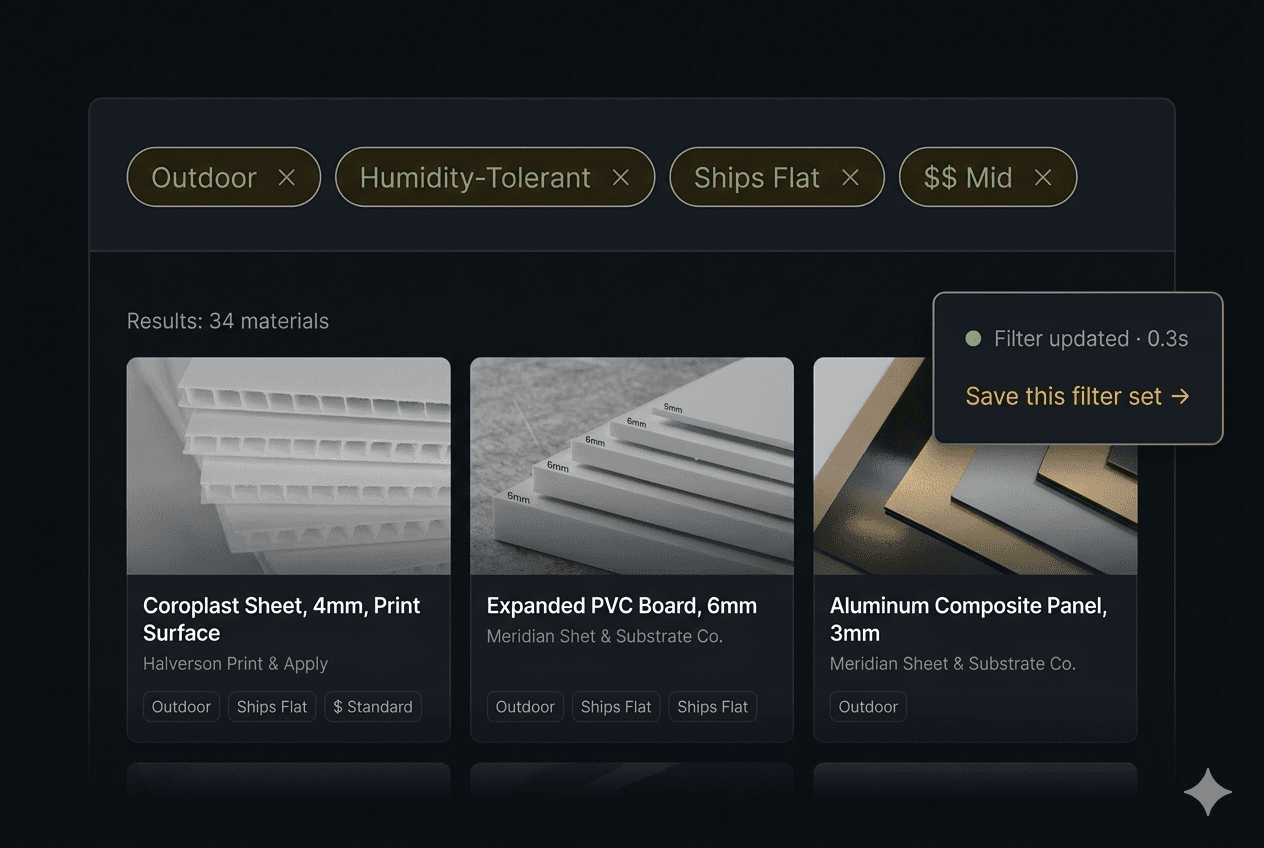 Search how producers actually think: ‘Outdoor, humidity-tolerant, ships flat, under $X per square foot, etc’ Results in seconds, not three rounds of vendor emails.