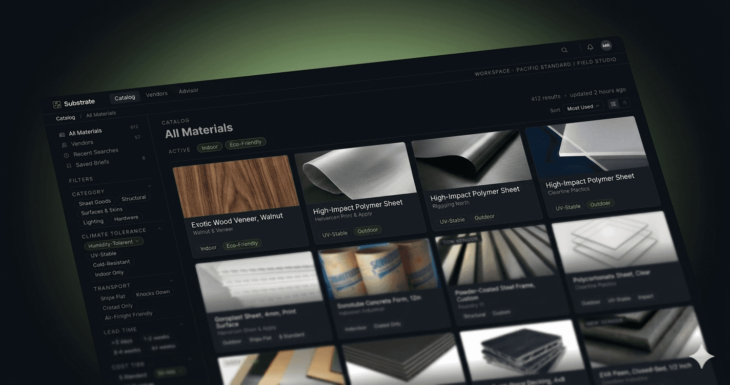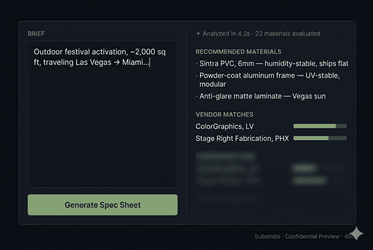 Stop guessing. Start building. Substrate knows what survives Vegas heat, Miami humidity, and a cross-country truck ride. Make smarter materials decisions for every activation.